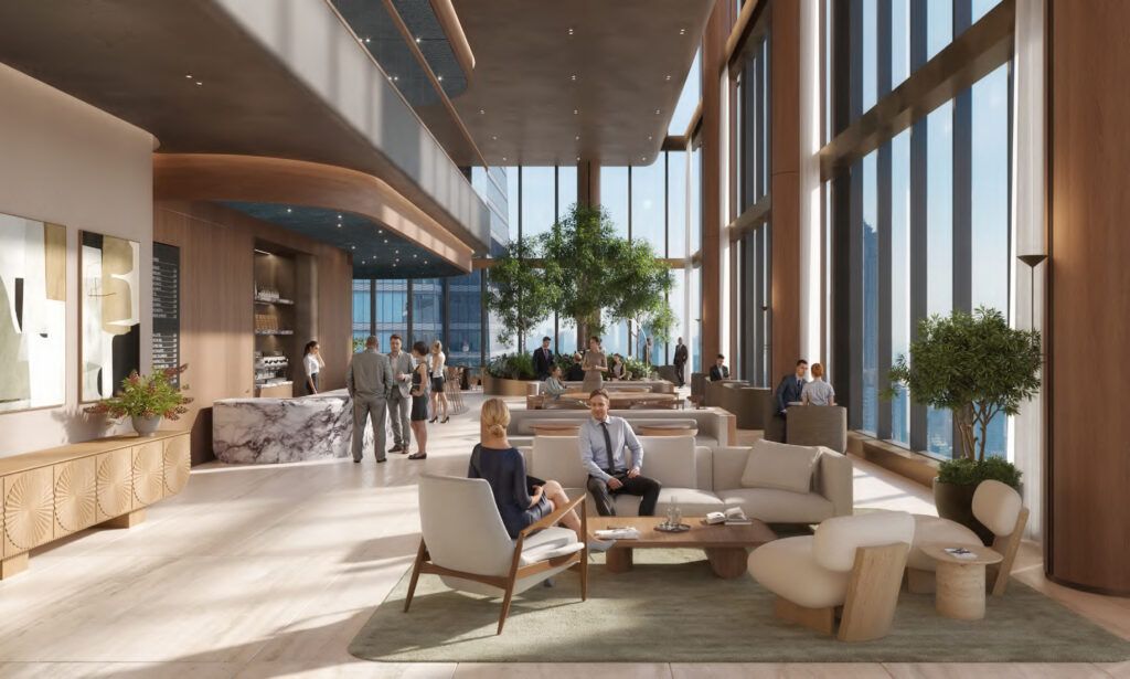 The double‑height amenity center on the 45th and 46th floors serves as the signature hospitality destination for tenants, supporting daily café use, coworking, conferences, and private events while acting as a key leasing and retention differentiator.